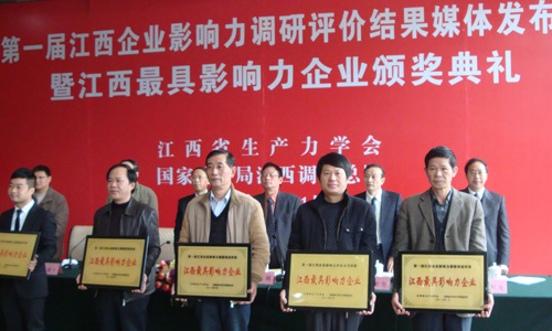 為了挖掘全省各行業(yè)在建設(shè)富裕和諧秀美江西中涌現(xiàn)出來的標(biāo)桿性企業(yè),打造行業(yè)形象典范,江西省生產(chǎn)力學(xué)會(huì)、國家統(tǒng)計(jì)局江西調(diào)查總隊(duì)聯(lián)合開展了第一屆江西企業(yè)影響力調(diào)研評(píng)價(jià)活動(dòng)。并于2012年3月21日在江西南昌舉行了調(diào)研評(píng)價(jià)結(jié)果媒體發(fā)布會(huì)暨江西最具影響力企業(yè)頒獎(jiǎng)典禮。