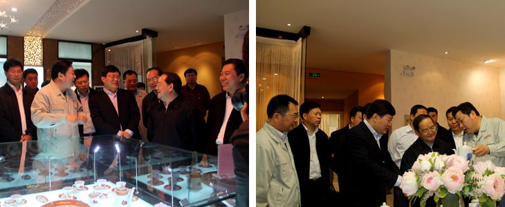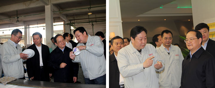 2012年4月6日江西省人民政府省長(zhǎng)鹿心社一行在市委書(shū)記鄧保生、市長(zhǎng)劉昌林等省市領(lǐng)導(dǎo)的陪同下來(lái)我司視察工作,鹿心社省長(zhǎng)一行參觀了工廠生產(chǎn)車(chē)間、國(guó)瓷館,詳細(xì)了解了公司的生產(chǎn)運(yùn)營(yíng)情 況并對(duì)公司產(chǎn)品贊不絕口。視察期間,鹿心社省長(zhǎng)對(duì)公司給予了高度評(píng)價(jià):“你們公司為景德鎮(zhèn)爭(zhēng)了光,為江西爭(zhēng)了光,為國(guó)家爭(zhēng)了光。"并希望公司能牢牢抓住精品路線,抓住高端市場(chǎng),搞活機(jī)制,繼續(xù)做的更大更好。