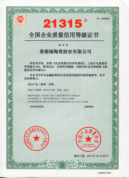 復審通過企業(yè)上報復審資料、中品質協(xié)質量信用評估中心有限公司進行質量信用等級評估,并出具質量信用等級評估報告,專家最終審核三項程序,最后得出評估意見:該公司信用良好,相關評價較高,產(chǎn)品質量穩(wěn)定,用戶信用度好。評估總分為574分,平均分為96分;認定其質量信用等級AAA級,并頒發(fā)了《中國21315質量信用等級AAA級證書》。